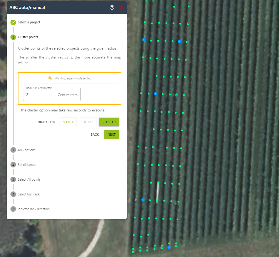 - Select a value for the point grouping radius. By default, this value is set to 2cm, which ensures optimum precision, taking RTK accuracy into account. It is strongly recommended to leave this setting at 2cm.