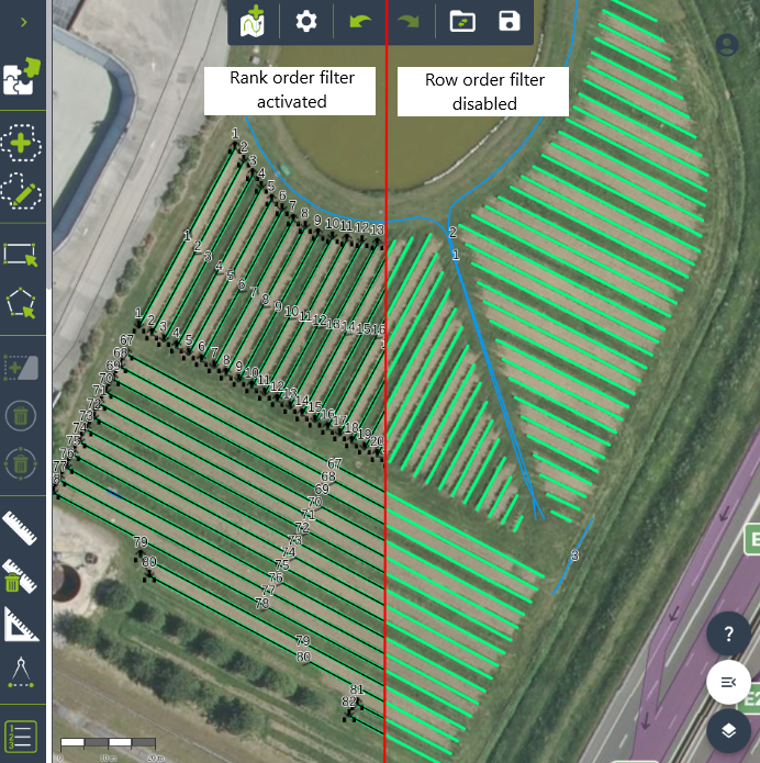This option automatically displays an additional filter to show row entries and endings, as well as the order of the rows and their direction. This option displays potential sources of error on the map: