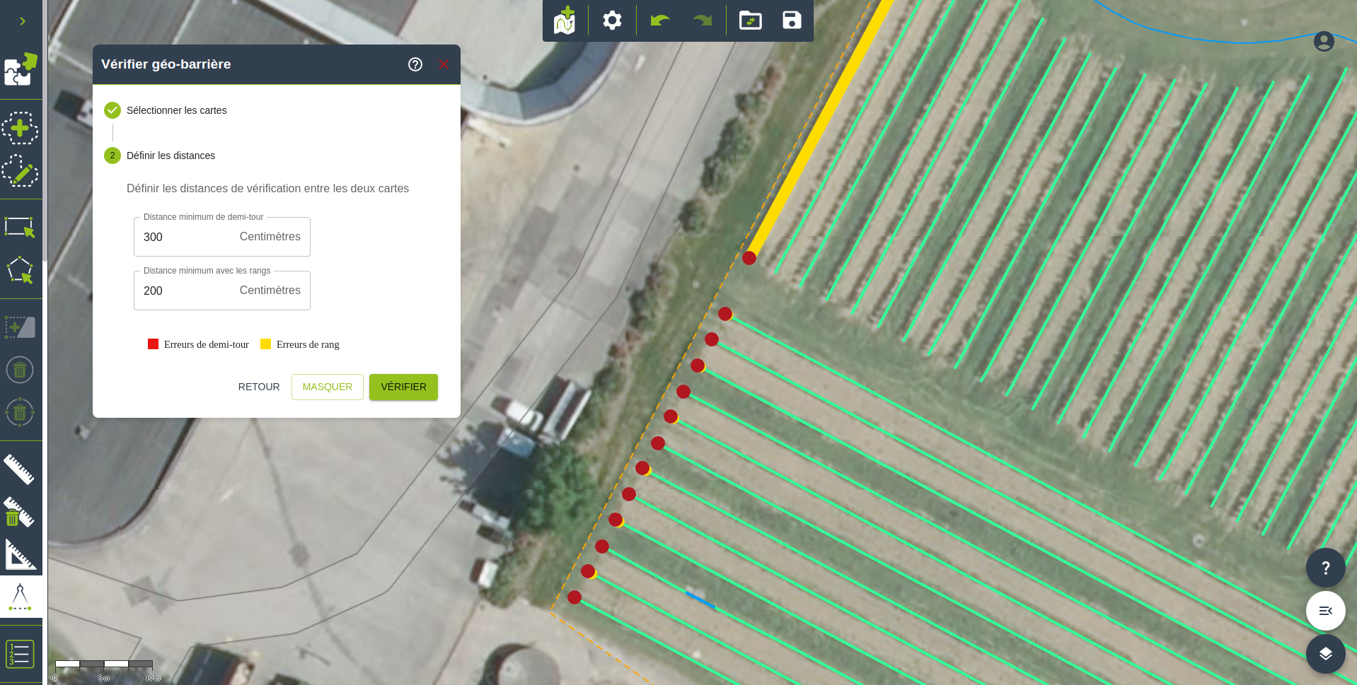 - La distance minimum de demi-tour pour vérifier que les extrémités de rangs soient à une distance de la géo-barrière supérieure ou égale à la valeur