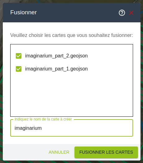 Cette option permet de fusionner plusieurs cartes chargées dans EasyMapping en une seule. Cela permet de générer une unique carte à partir de plusieurs cartes existantes, ou traiter une seule carte issue de plusieurs fichiers GPS différents (par exemple enregistrés en plusieurs fois).